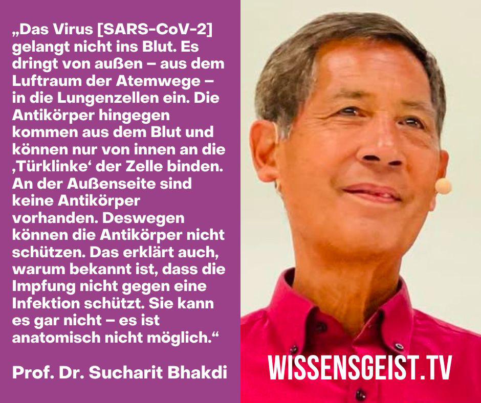 Prof. Dr. med. Sucharit Bhakdi erläutert in seinem Vortrag, warum die Antikörper aus genbasierten COVID-19-Impfstoffen (z. B. mRNA-Impfstoffe von BioNTech/Pfizer oder Moderna sowie Vektor-Impfstoffe von AstraZeneca oder Johnson & Johnson) keine Infektion mit SARS-CoV-2 verhindern können.Das Virus dringt über die Atemwege von außen in die Lungenzellen ein und gelangt dabei nicht ins Blut. Die impfbedingten Antikörper zirkulieren jedoch ausschließlich im Blut und können daher nur von innen an die Zellen binden – sie erreichen die Außenseite der Lungenzellen (die „Türklinke von außen“) nicht.